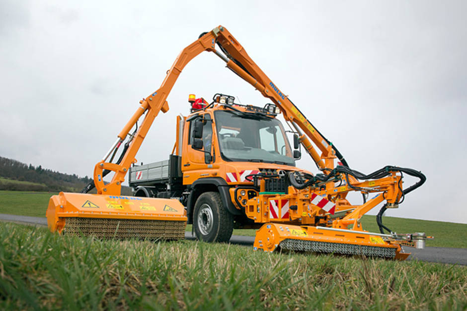 Die neuen Unimog Geräteträger sind ausgestattet für Grünpflege und Winterdienst: sei es Schnee zu räumen, Streusalz gegen Eis auszubringen oder sogenanntes Straßenbegleitgrün zu pflegen – hier gilt es, vor und hinter den Leitplanken sowie um die Leitpfosten herum störende Gräser, Pflanzen, Büsche und Bäume zu mähen, schneiden und zu fällen.