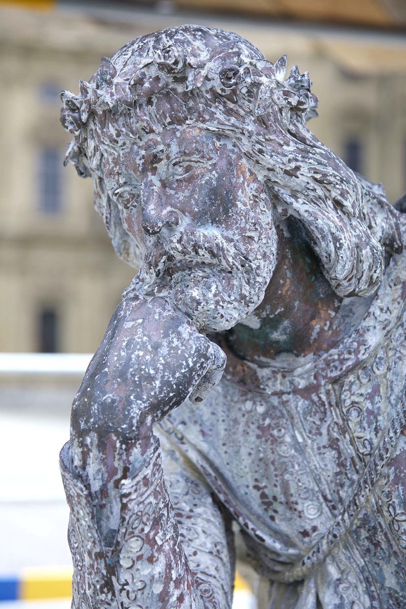 „Vor der Reinigung war es nicht möglich den Zustand der Bronzefiguren zu erkennen. Jetzt sind wir in der Lage, diese genauer zu begutachten und daraus abzuleiten, wie wir die schützende Patina erhalten können“, erklärt Hannah Holland, Metallrestauratorin im Restaurierungszentrum der Bayerischen Schlösserverwaltung. Hierzu sind verschiedene Techniken denkbar. Der Einsatz von Chemikalien wäre nicht reversibel, weswegen vermutlich eingefärbte Wachse verwendet werden. „Wachs lässt sich regelmäßig erneuern und schützt die Bronze mit ihrer Patina vor neuer Verkalkung. Außerdem können wir mit eingefärbten Wachsen wie bei der Gemälderestauration retuschieren, bis das gewünschte Ergebnis erreicht ist“, so die Restauratorin.