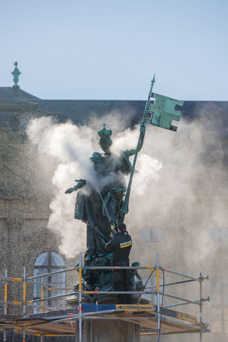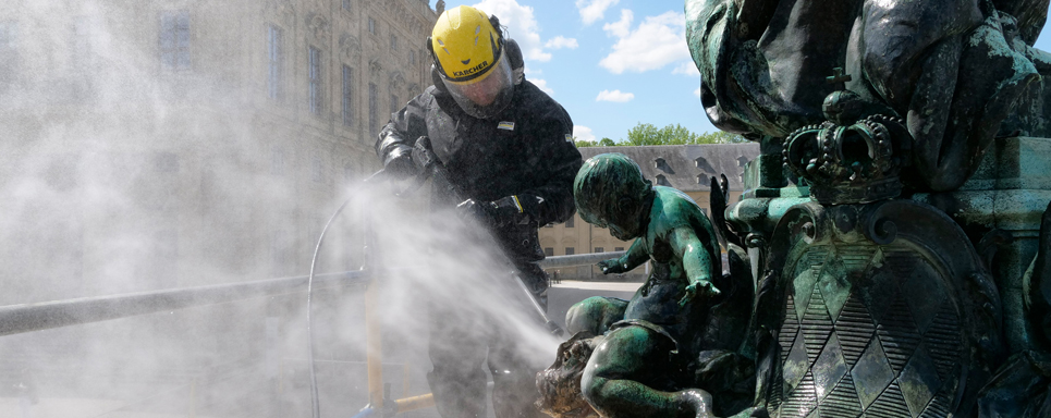 In enger Abstimmung mit dem Restaurierungszentrum der Bayerischen Verwaltung der staatlichen Schlösser, Gärten und Seen wurde das Vorgehen geplant und durchgeführt. Für die Entfernung der Kalkschichten setzte Nick Heyden, Reinigungsexperte von Kärcher, Kaltwasserhöchstdruck mit bis zu 500 bar ein. „Während der umfangreichen Voruntersuchungen und Tests hat sich herausgestellt, dass wir mit dieser Methode trotz des Drucks auf metallischen Oberflächen sehr schonend arbeiten können“, so Heyden. Einen Großteil des Kalks konnte er so entfernen. Diese Technik wurde zuvor schon am Stuttgarter Schlossbrunnen erfolgreich eingesetzt.