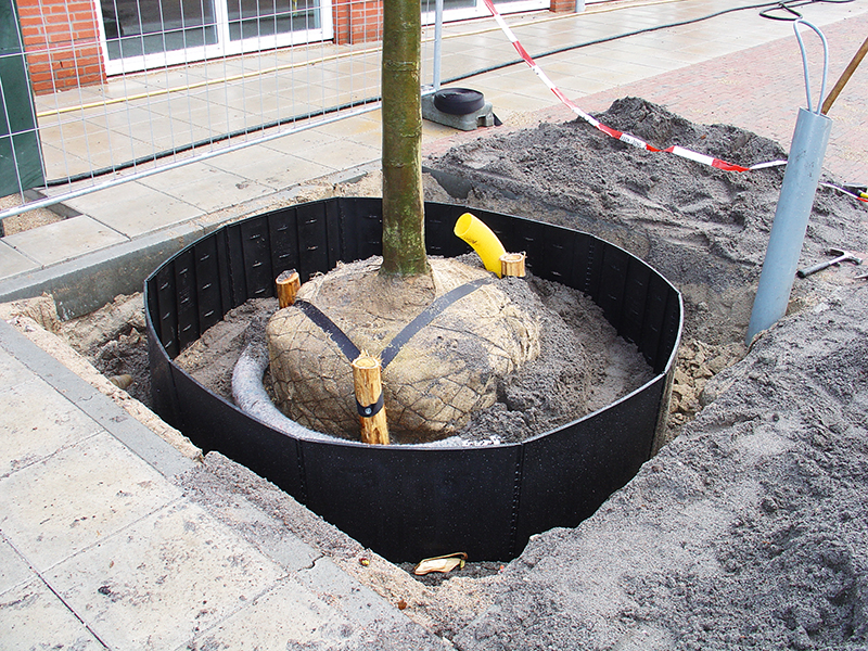 Eine Wurzelführung plant Magerl daher bei jeder Baumpflanzung mit. Das Sortiment von GEFAguard umfasst Platten und Bahnen in unterschiedlichen Stärken. Aus 50 Prozent Recycling-Kunststoff sind die TRG-Platten in Höhen von 30 bis 120 cm gefertigt. Die einzelnen Platten werden über ein einfaches Verschlusssystem zum Kreis verbunden. Mit den neu eingeführten Eckelementen für Platten der Größe 45 und 60 cm bietet sich allerdings auch die Möglichkeit, rechteckig angelegte Pflanzgruben komplett auszukleiden. Die Wurzeln wachsen entlang der Führungsrippen senkrecht nach unten, tief ins Erdreich. Und damit weg von der städtischen Infrastruktur.