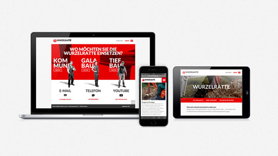 Übersichtlich, informativ und responsiv – so kommt die neue Website der Wurzelratte daher. Egal mit welchem Gerät Galabauer, Tiefbauer oder Mitarbeiter von Kommunen die Seite ansteuern, auf der jeweils für sie passend aufbereiteten Unterseite finden sie genau die Informationen, die sie zur Rodung mit der Wurzelratte benötigen.