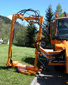 Hydraulische Verstellung: seitlich 60 cm, Höhe 65 cm, Querneigung, Spreizen der Mähteller, Ein-Mann-Bedienung möglich.