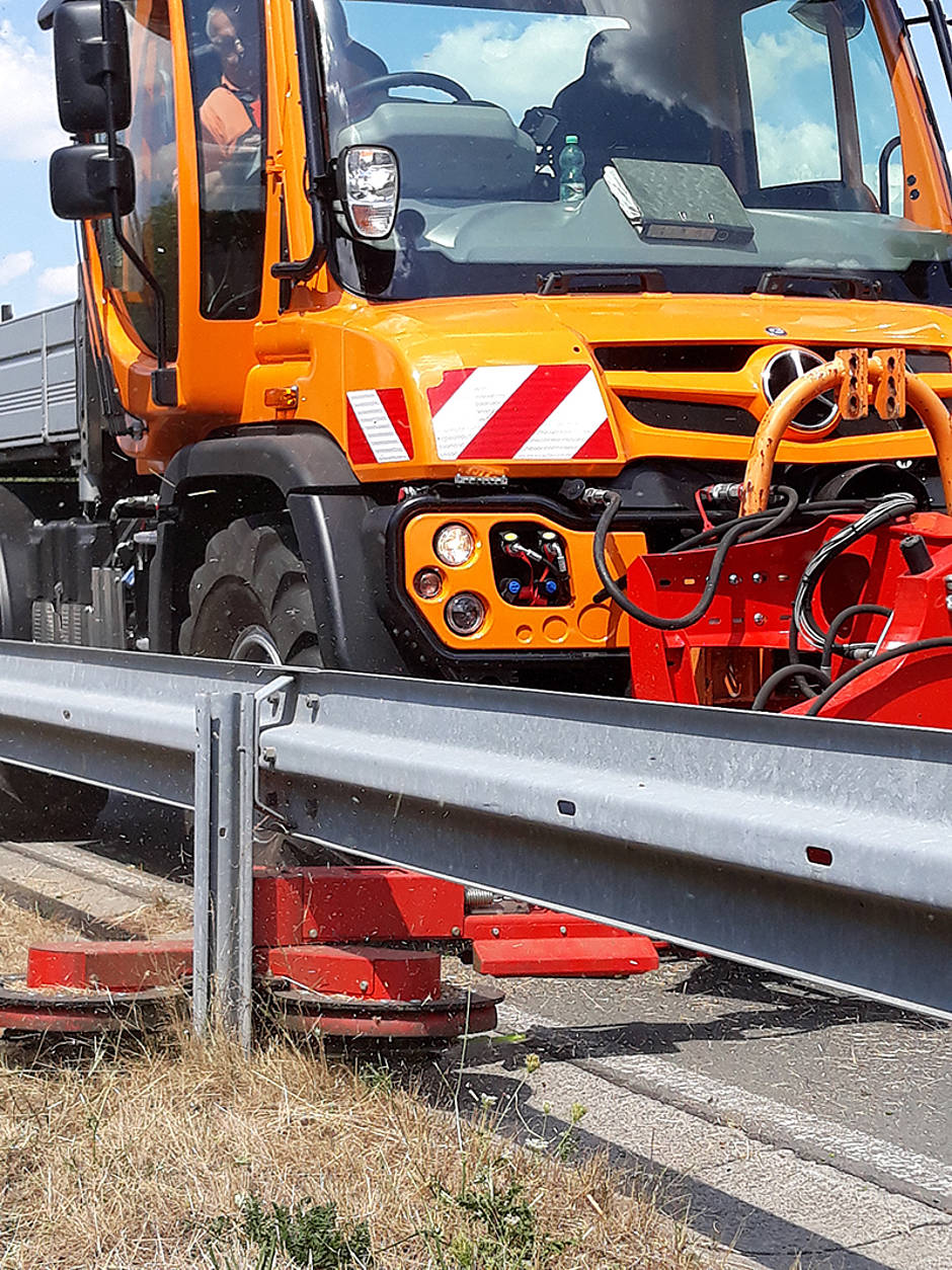 Mit dem Zaunkönig der Kneilmann Gerätebau GmbH bleibt kaum ein Halm stehen. Dank der sehr niedrigen Bauweise seines Mähkopfes kommt er mühelos unter die Schutzplanken und mäht sauber den direkten Bewuchs an den Pfosten. Auch an Leitpfosten ist der Zaunkönig sehr wirtschaftlich einzusetzen.