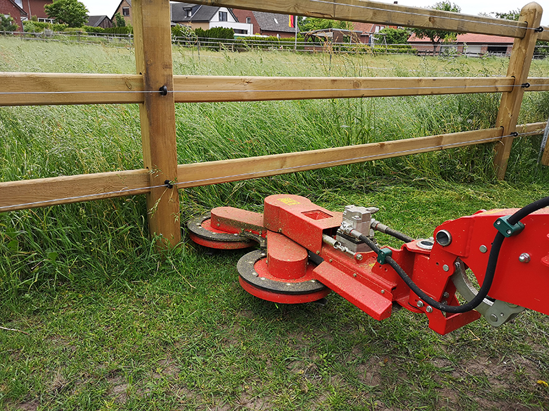 Sauber Freimähen ohne Sogwirkung mit Stahlklingen, Nylon-Mähfäden oder Klingen in Kombination mit Mähfäden: Je nach Stärke des Bewuchses lassen sich die einzelnen Köpfe des Mähsterns mit je zwei Mähwerksklingen oder mit Nylon-Mähfäden ausstatten. Selbst die Kombination aus Klingen, die innerhalb eines schützenden Tellers rotieren, und Nylon-Mähfäden, die über den Teller hinausragen und selbst den Bewuchs direkt am Pfosten erfassen, ist möglich. Dabei schützen die Kunststoffgleitschienen die Pfosten selbstverständlich vor Anfahrbeschädigungen.