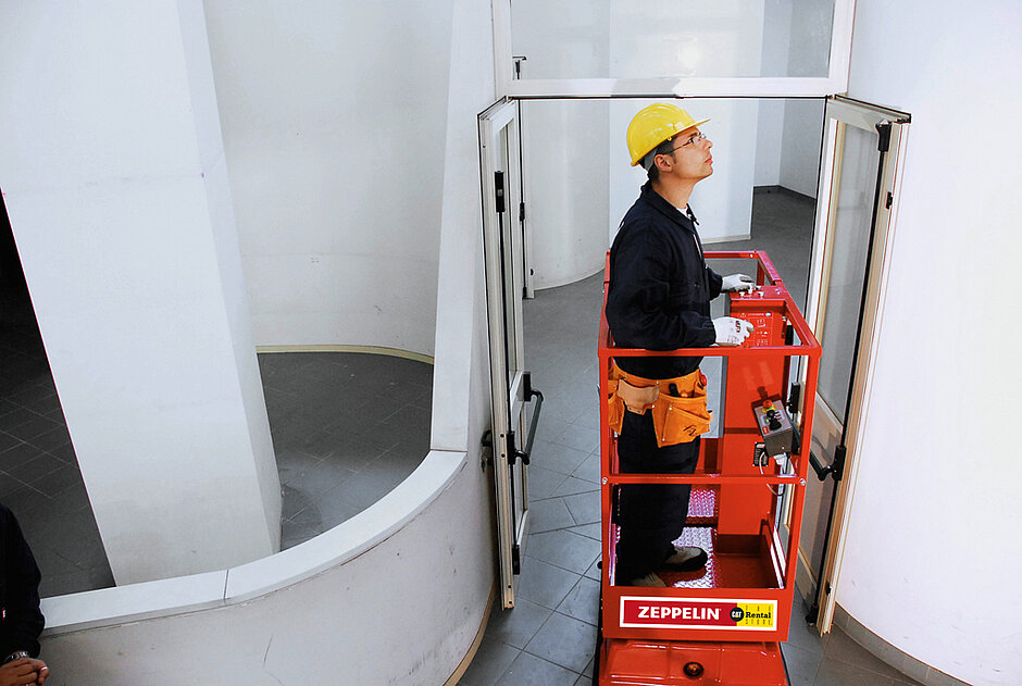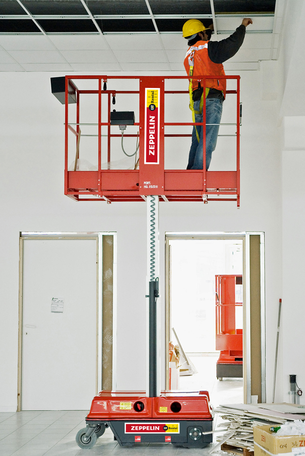 Diese eignen sich besonders für Einsätze im Innenbereich, denn dank eines Gewichts von nur 508 Kilogramm und kompakter Abmessungen passen sie durch jede Normtür sowie in Aufzüge und können so auch in höheren Stockwerken eingesetzt werden. Das mühsame Aufbauen und Umsetzen von Leitern oder Baugerüsten entfällt, denn gerade für Kurzeinsätze mit oft wechselnden Einsatzorten stellt die Vertikalbühne die optimale Lösung dar. Sie ist mit Hochleistungsbatterien und abriebfreien Reifen ausgestattet und damit für Arbeiten auf empfindlichen Böden genauso gerüstet wie für den harten Baustelleneinsatz. Als Dienstleister bietet Zeppelin Rental für alle Modelle vor der Vermietung selbstverständlich eine umfangreiche Bedienungseinweisung an.