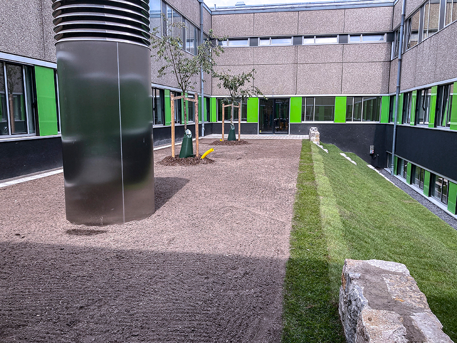 Der Startschuss für die Baumaßnahme fiel im Frühjahr 2021. In einem 30 mal zwölf Meter großen Innenhof, bisher eine Brachfläche, sollten zwei Terrassen, zwei Natursteinmauern und eine Böschung angelegt werden. Was einfach klingt, bot mehrere Herausforderungen. „Der Ansaugturm einer Lüftungsanlage befindet sich direkt im Hof. Er versorgt die Produktionsbereiche einer Apotheke der Medizinischen Hochschule mit Frischluft. Und diese Räumlichkeiten müssen steril sein“, erklärt Funke. Aus diesem Grund kamen dieselbetriebene Baumaschinen und -geräte nicht in Frage, der Auftraggeber forderte komplett emissionsfreies Arbeiten.