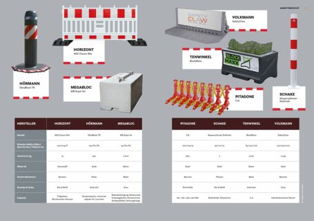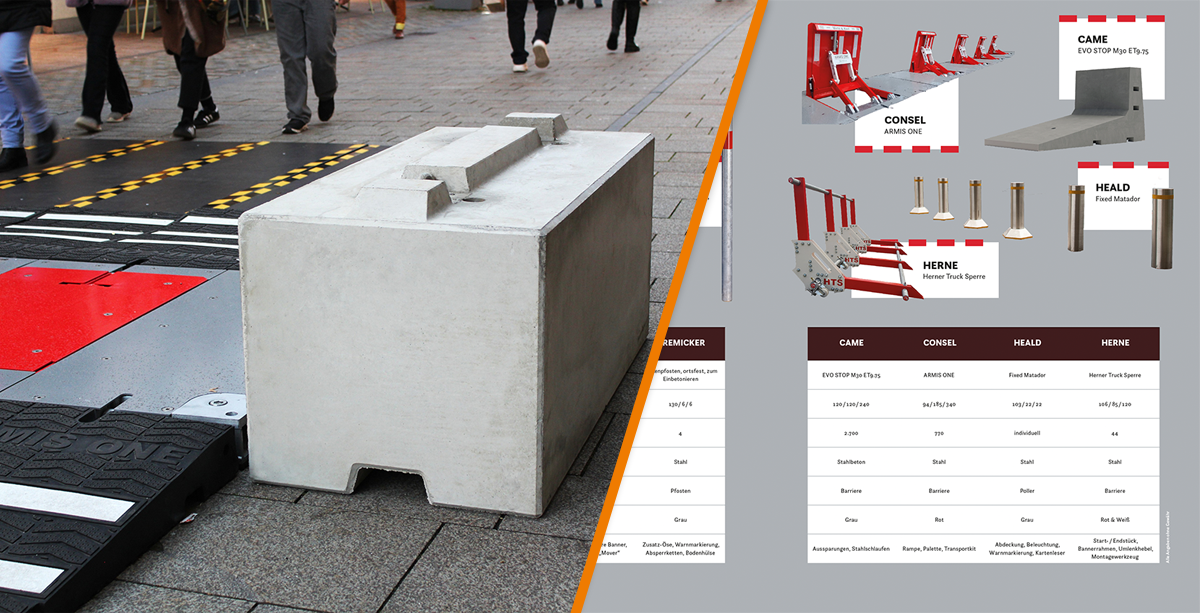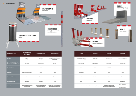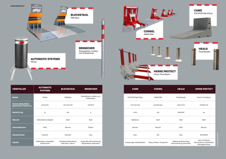Diese Marktübersicht soll einen begrenzten Überblick über solche Systeme bieten. Dabei gibt es für jede Absperrungs-Art eine Fülle an weiteren Herstellern, und die erwähnten haben neben den aufgeführten Produkten weitere Sperren derselben oder einer anderen Art im Portfolio. Zudem unterscheiden sich die Produkte hinsichtlich ihres Abfang-Potenzials stark, weshalb die teils schwer zu ermittelnde Aufprall-Energie, die von den Absperrungen aufgefangen werden kann, in der Übersicht keine Verwendung findet.