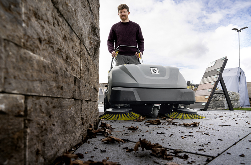 Bei randnahem Arbeiten schützt die robuste Konstruktion die Maschine zuverlässig vor Beschädigungen. Dafür sorgen beispielsweise der doppelwandige Rahmen und die stoßgeschützten Seitenbesen. Die rotierende Kehrwalze ist pendelnd gelagert. Sie passt sich so bestmöglich verschiedenen Untergründen an, was für ein sehr gutes Reinigungsergebnis sorgt. Ein verschleißbedingtes Justieren ist nicht erforderlich. Die Kehrwalze und der Seitenbesen lassen sich werkzeuglos wechseln. Die Arbeitsbreite mit einem Seitenbesen beträgt 850 mm, wird ein zweiter, optionaler Seitenbesen montiert, sind es 1.050 mm.