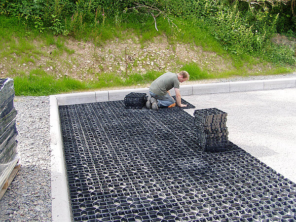 Rasengitter aus stabilem Recyclingkunststoff: Der Einsatz dieser Lösung vermeidet unnötige Versieglungen der Flächen und ermöglicht das Versickern von Regenwasser. Damit leisten Kunden einen kleinen Beitrag zur Vermeidung von Hochwässern in der Zukunft.