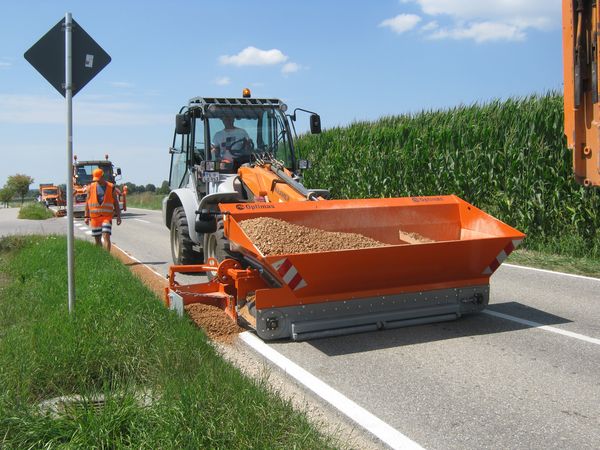 Mit der Schaufel ist es sehr einfach, Material wie z.B. Beton, Asphalt, Schüttgüter (Sand, Splitt, Schotter, Mutterboden, Salz etc.) gleichmäßig über ein Förderband zu verteilen. Die Schaufel wird über ein Förderband seitlich entleert, dabei wird die Materialmenge exakt durch Förderband- und Fahrgeschwindigkeit dosiert. Mittlerweile setzen viele Kommunen die Schaufel im Bankettbau bzw. zur Bankettpflege ein. Aber auch im Hochwasserschutz zur Befüllung von Sandschläuchen / Sandsäcken oder im Winterdienst zur Befüllung von Salzkübeln leistet die Schaufel sehr gute Dienste.