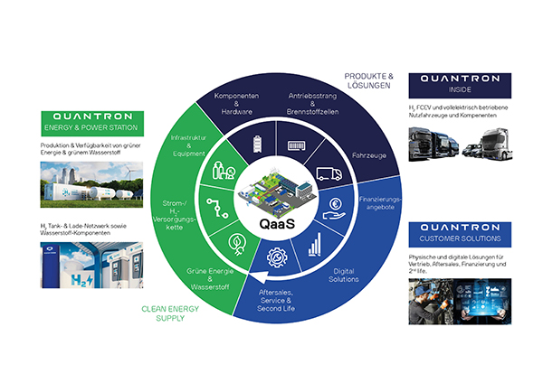 Mit dem Quantron-as-a-Service Ecosystem (QaaS) bietet QUANTRON ein Gesamtkonzept, das alle Facetten der Mobilitätswertschöpfungskette umfasst: QUANTRON INSIDE beinhaltet ein breites Angebot an sowohl Neufahrzeugen als auch Umrüstungen für Bestands- und Gebrauchtfahrzeuge von Diesel- auf batterie- und wasserstoffelektrische Antriebe mit der hoch-innovativen QUANTRON INSIDE Technologie. QUANTRON CUSTOMER SOLUTIONS gewährleistet mit einem europaweiten Netzwerk von 700 Servicepartnern digitale und physische Aftersales-Lösungen sowie ein Serviceangebot für Wartung, Reparatur und Ersatzteile, Telematik- und In-Cloud-Lösungen für Ferndiagnose und Flottenmanagement. Kunden erhalten eine individuelle Beratung zu u. a. maßgeschneiderten Lade- und Tanklösungen, Miet-, Finanzierungs- und Leasingangeboten. In der QUANTRON Academy werden außerdem Schulungen und Workshops angeboten. QUANTRON ENERGY & POWER STATIONS wird zukünftig als Plattform die Produktion von grünem Wasserstoff und Strom realisieren. Dafür hat sich die Quantron AG mit starken globalen Partnern zusammengeschlossen. Diese Clean Transportation Alliance bildet gleichzeitig auch einen wichtigen Baustein für die Versorgung von Fahrzeugen mit der notwendigen grünen Lade- und H2-Tank-Infrastruktur.